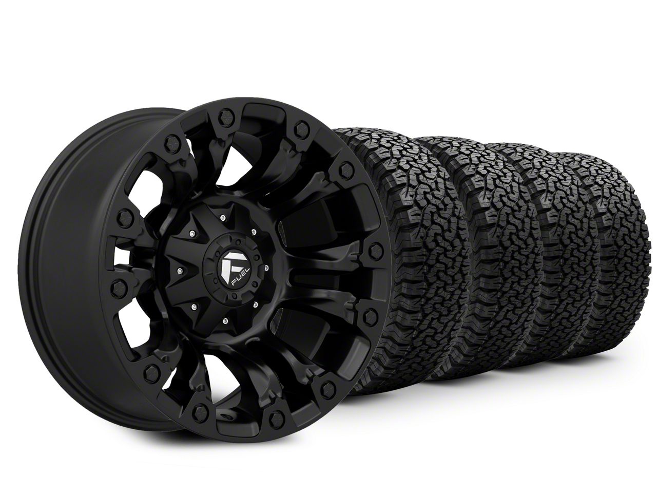 Mounted and Balanced Wheel and Tire Kit. This wheel and tire combo kit features (4) 18x9 Vapor Matte Black 5-Lug Wheels and (4) BF Goodrich All-Terrain T/A KO 285/65R18 tires that have been put together into an easy to buy kit that arrives to your door already mounted and balanced ready to be installed on your vehicle.