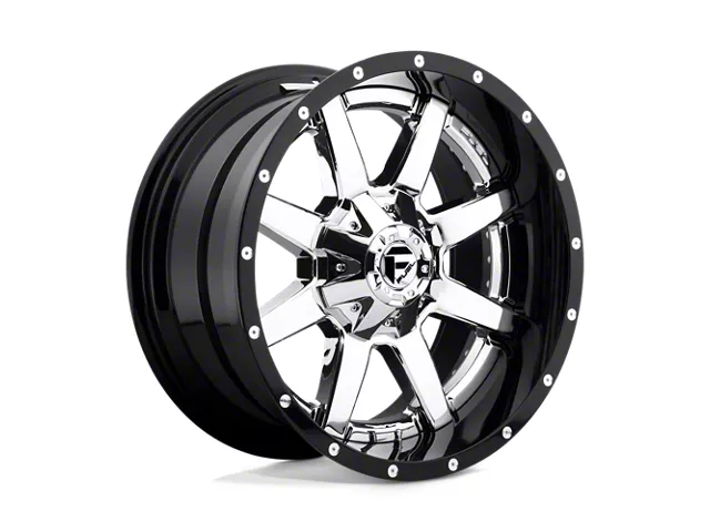 Fuel Wheels Maverick Chrome with Gloss Black Lip 8-Lug Wheel; 24x12; -44mm Offset The Fuel Wheels Maverick Chrome with Gloss Black Lip 8-Lug Wheel combines a sleek, sophisticated design with premium construction that enhances the visual appeal and complements a wide range of vehicle styles. This wheel is perfect for those seeking to make a bold statement while maintaining elegance and robustness.