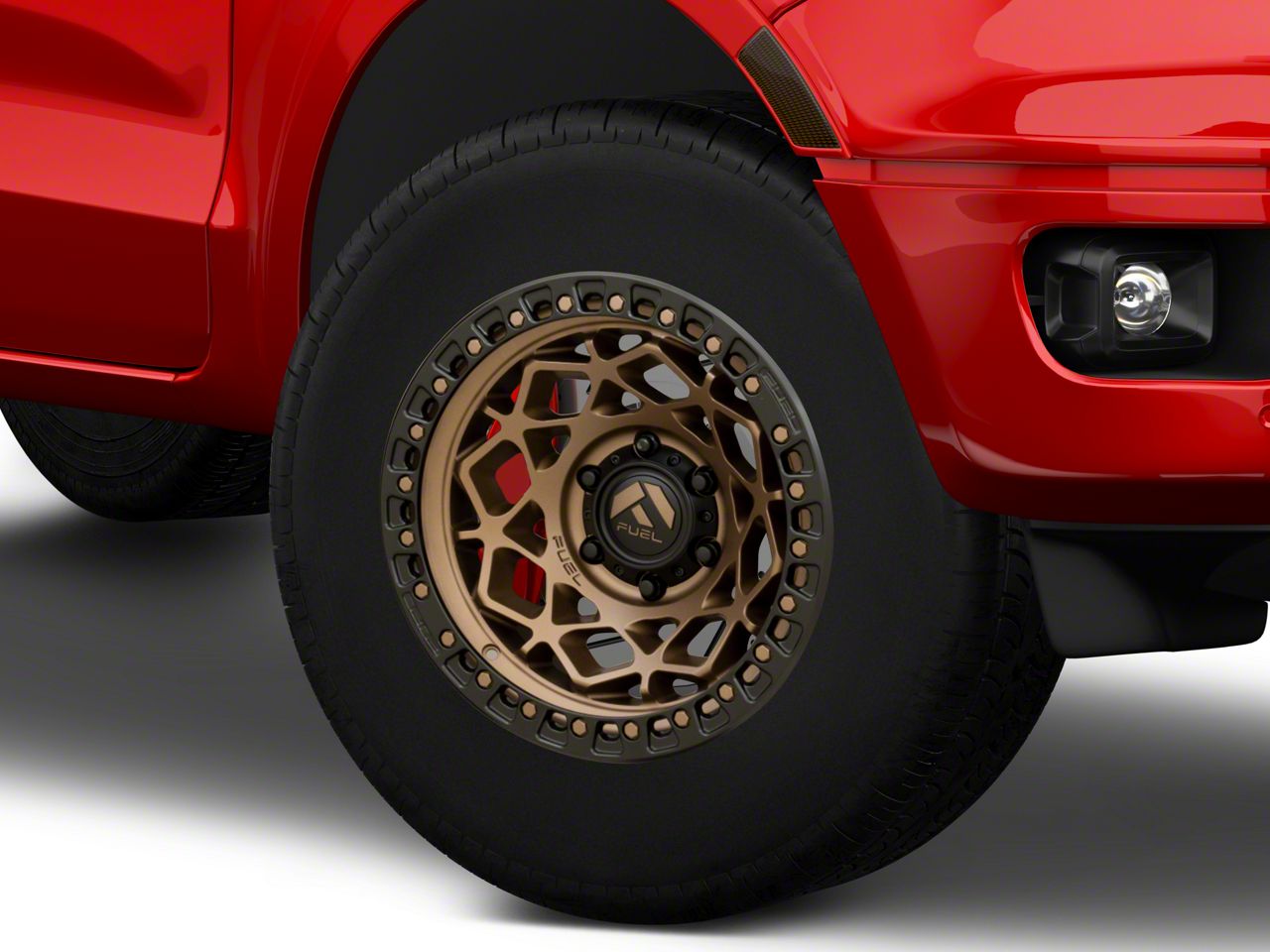 Application. This Fuel Wheels Unit Bronze with Matte Black Ring 6-Lug Wheel; 17x9; 1mm Offset with a backspace of 5.2004 Inch, 128.1mm and bolt pattern of 6 x 139.7mm (6 x 5.5-Inch) ensures impeccable alignment and driving stability. It's designed to fit the 2019-2023 Ranger models, sold individually.Fuel Wheels D78517908450