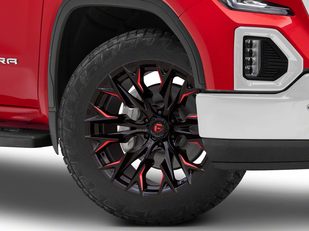 Application. This Fuel Wheels Flame Gloss Black Milled with Candy Red 6-Lug Wheel; 22x10; -18mm Offset, with a backspace of 4.791 Inch, 121.7mm and bolt pattern of 6 x 139.7mm (6 x 5.5-Inch), is designed to provide not only a striking visual appeal but also to contribute significantly to the alignment and driving stability of the vehicle. Its specifications ensure a precise fit with the vehicle model, enhancing the overall driving experience. Built to fit the 2019-2026 Sierra 1500, this wheel is sold individually.