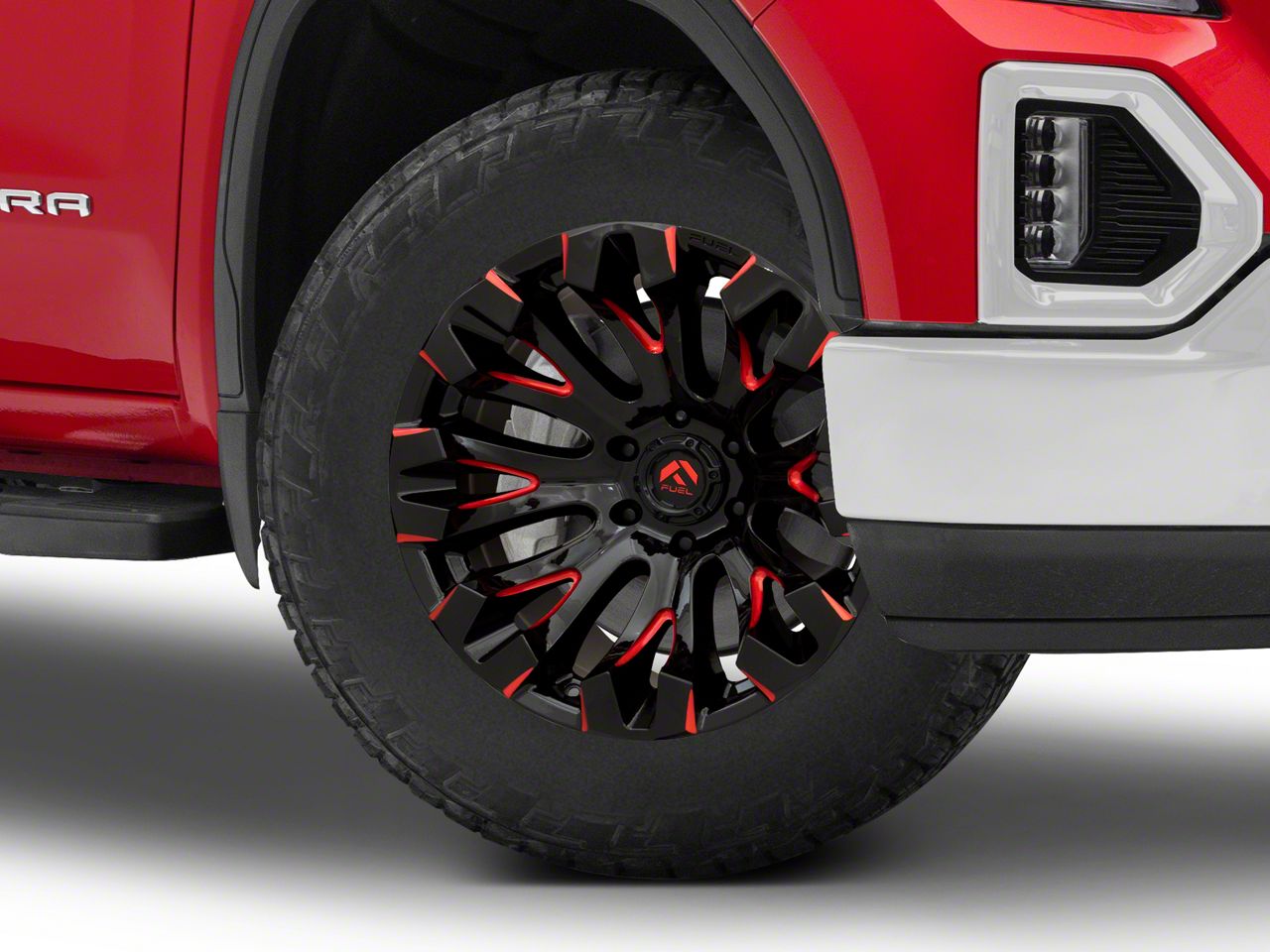 Fuel Wheels Quake Gloss Black Milled with Red Accents 6-Lug Wheel; 20x10; -18mm Offset: Immerse your vehicle in style and elegance with this wheel's captivating matte black finish. The unique 10-hole design of this Mammoth wheel sets your vehicle apart, making a statement on the road. Whether cruising the city streets or heading out for a weekend escape, this wheel complements a wide range of vehicle styles.