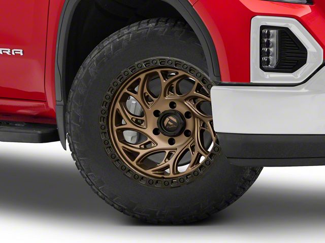 Application. This Fuel Wheels Runner OR Bronze with Black Ring 6-Lug Wheel; 20x9; 1mm Offset with a backspace of 5.039 Inch, 128mm; and bolt pattern of 6 x 139.7mm (6 x 5.5-Inch) contributes to impeccable alignment and driving stability. Designed to fit 2019-2026 Sierra 1500 models, sold individually.