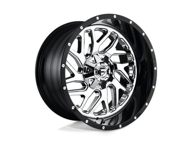 Fuel Wheels Triton Chrome with Gloss Black Lip 8-Lug Wheel; 20x10; -19mm Offset The Fuel Wheels Triton Chrome with Gloss Black Lip 8-Lug Wheel combines a sleek, sophisticated design with premium construction that enhances the visual appeal and complements a wide range of vehicle styles. This wheel is perfect for those seeking to make a bold statement while maintaining elegance and robustness.