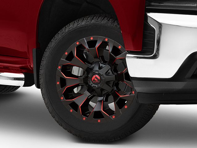 Fuel Wheels Assault Matte Black Red Milled 6-Lug Wheel; 20x9; 19mm Offset The Fuel Wheels Assault Matte Black Red Milled 6-Lug Wheel combines a sleek, sophisticated design with premium construction that enhances the visual appeal and complements a wide range of vehicle styles. This wheel is perfect for those seeking to make a bold statement while maintaining elegance and robustness.