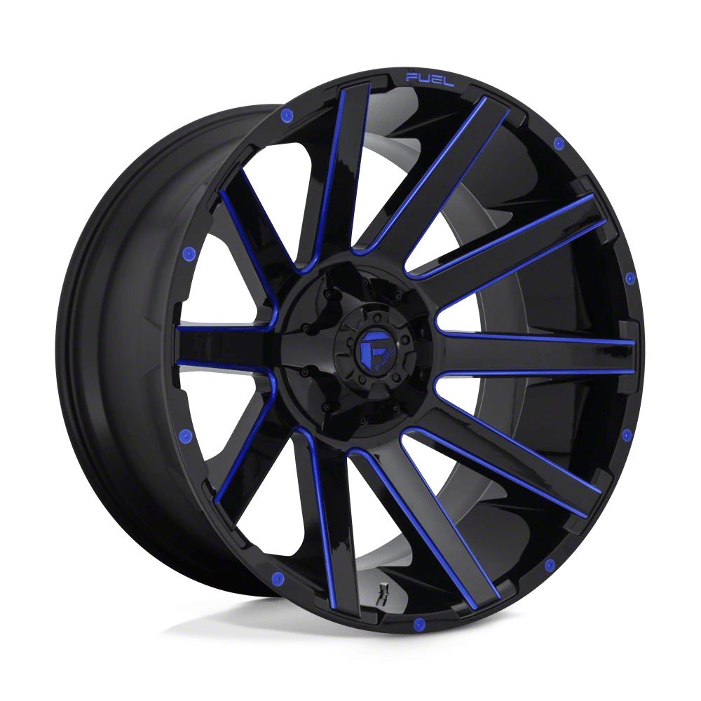 Fuel Wheels Contra Gloss Black with Blue Tinted Clear 8-Lug Wheel; 24x14; -75mm Offset The Fuel Wheels Contra Gloss Black with Blue Tinted Clear 8-Lug Wheel combines a sleek, sophisticated design with premium construction that enhances the visual appeal and complements a wide range of vehicle styles. This wheel is perfect for those seeking to make a bold statement while maintaining elegance and robustness.