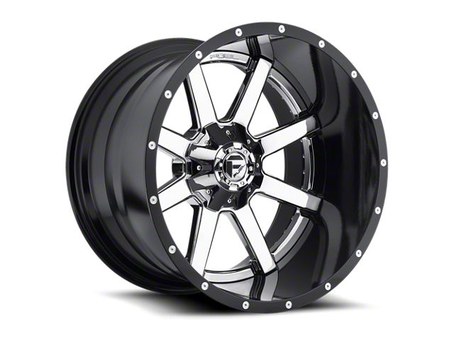 Fuel Wheels Maverick Chrome with Gloss Black Lip 8-Lug Wheel; 20x12; -44mm Offset exudes a sleek aesthetic appeal, complementing a range of vehicle styles. Its dark stainless finish emanates sophistication, while the brand reputation of Fuel Wheels ensures robustness. This wheel seamlessly merges elegance with durability.