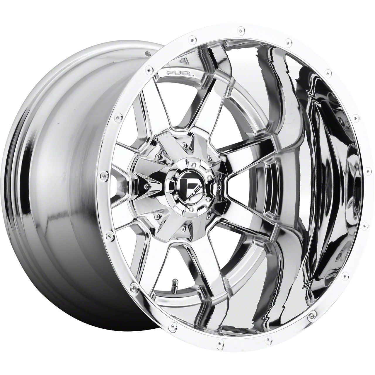 Fuel Wheels Maverick Chrome 8-Lug Wheel; 20x14; -76mm Offset exudes a sleek aesthetic appeal, complementing a range of vehicle styles. Its dark stainless finish emanates sophistication, while the brand reputation of Fuel Wheels ensures robustness. This wheel seamlessly merges elegance with durability.