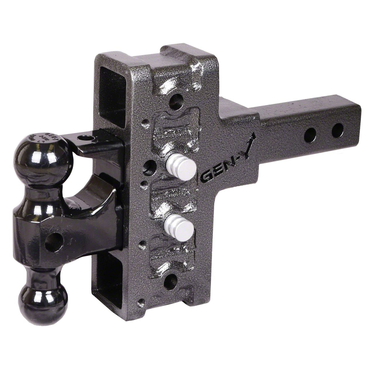 Four-Way Adjustable Design. The Gen-Y Hitch Mega-Duty 5-Inch Drop Hitch features a unique offset design with 4-way adjustability. The difference is, whether you use this hitch dropped or raised you will always have one slot on it’s the opposite side. This design offers a number of carrying options apart from excellent adaptability. In total, this hitch offers 5 inches of drop or rise, with one slot above the shank. This drop hitch also includes a pintle lock and a 2-inch/2.312-inch dual ball mount for added versatility. Lastly, this hitch can be used with most 2-inch receivers.