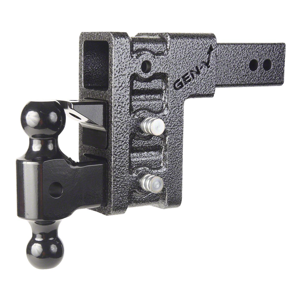 High-Strength Drop Hitch. Equip your vehicle with a simple yet dependable tow hitch by mounting this Gen-Y Hitch Mega-Duty 2-Inch Receiver Hitch 10K Adjustable Ball Mount 5-Inch Drop Hitch with Pintle Lock. Its enhanced adjustability allows for use in any wheelbase configuration, thanks to its dual-ball mount and 3 stacked receivers. Furthermore, this towing equipment has a 10,000-pound gross tow rating and a 1,500-pound tongue weight rating.