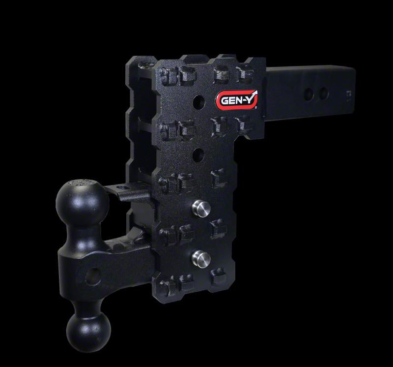 Heavy-Duty Adjustable Hitch. The Gen-Y Hitch PHANTOM-X 16K Adjustable 2.50-Inch Receiver Hitch Dual-Ball Mount is engineered for serious towing applications. Featuring a 7.50-inch drop, this hitch provides exceptional height adjustability, ensuring a level and stable towing experience. With a 16,000-pound towing capacity, it is designed for pulling heavy trailers, campers, and equipment with ease.
