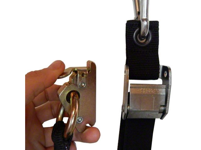Description. The straps feature an E-track clamp fixed to one end of the strap and a zinc plated steel carabiner at the other. The hooks connect to the cargo net and a heavy-duty cam buckle in the center is used to cinch the strap tight.