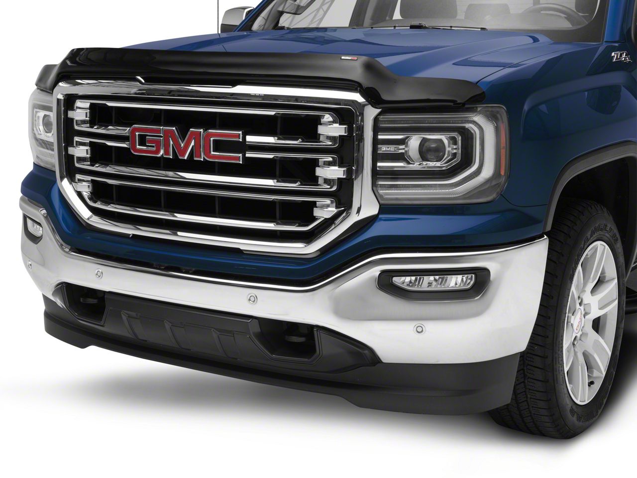 Prevent Stone Chips. Customize the front end of your 2014-2014 GMC Sierra with a WeatherTech Stone & Bug Deflector. Sitting on the leading edge of the hood, this smoke gray aerodynamic guard adds flare to the front grille and protects the hood from stone chips and potentially staining bug splatter, and also lessens wind noise by tightening up the gap between the hood and grille. Using 3D imaging and laser technology, each hood protector is applicatoin specific and not universal, thereby guaranteeing a precise fit and look on your pickup.