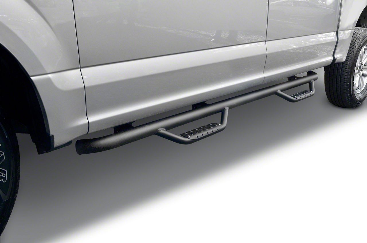 Easier and More Secure Entry and Exit. These Dominator D2 Cab Length Side Step Bars - Textured Black enables entry into and exit from the Ford F-150 SuperCrew with greater ease than ever before. Each bar has a pair of hoops for complete cab access, with step pads on them for preventing slippage.
