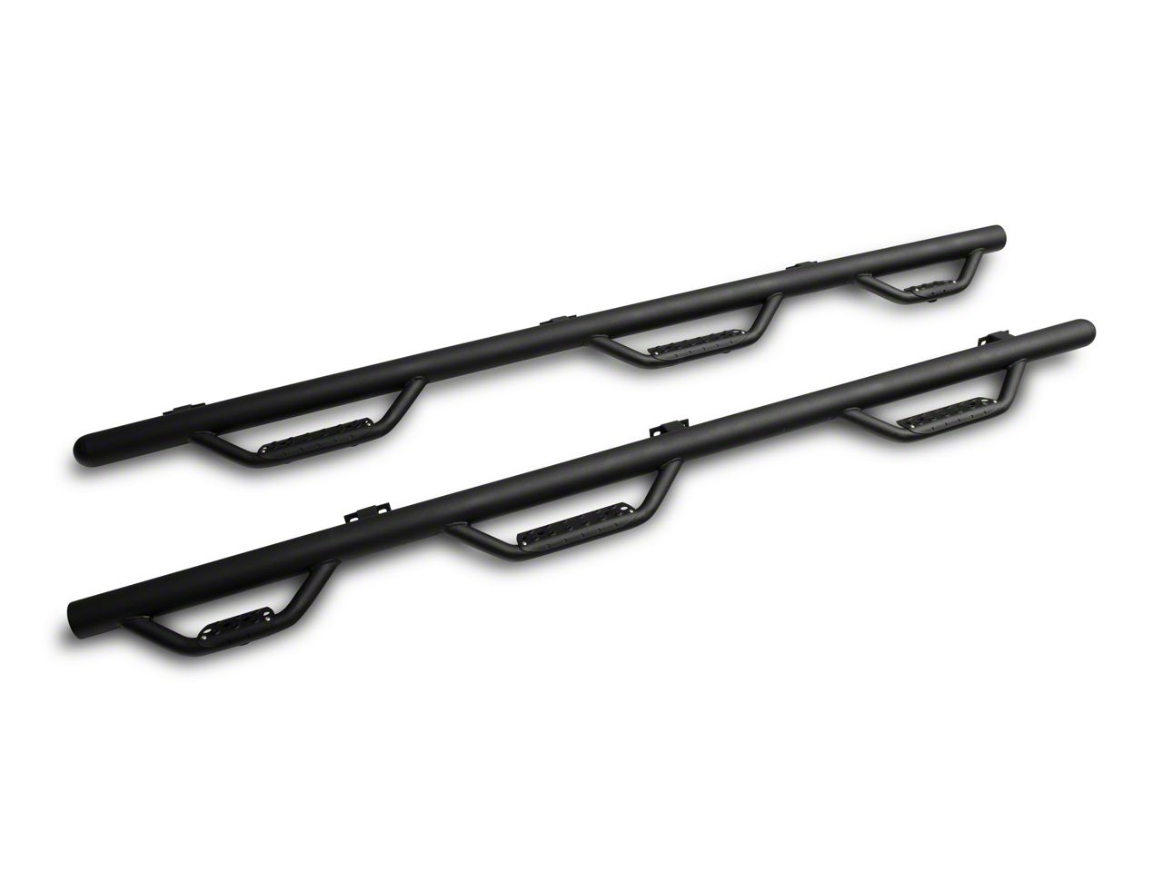 Heavy-Duty Side Step Bars. These Dominator D3-1 Piece Wheel to Wheel Side Step Bars - Textured Black are a pair of hardcore side step bars for the trails, featuring extra traction punched steel step pads, 3 inch mild steel tubing, and 3 drop-down steps that extend from wheel to wheel for extra support.