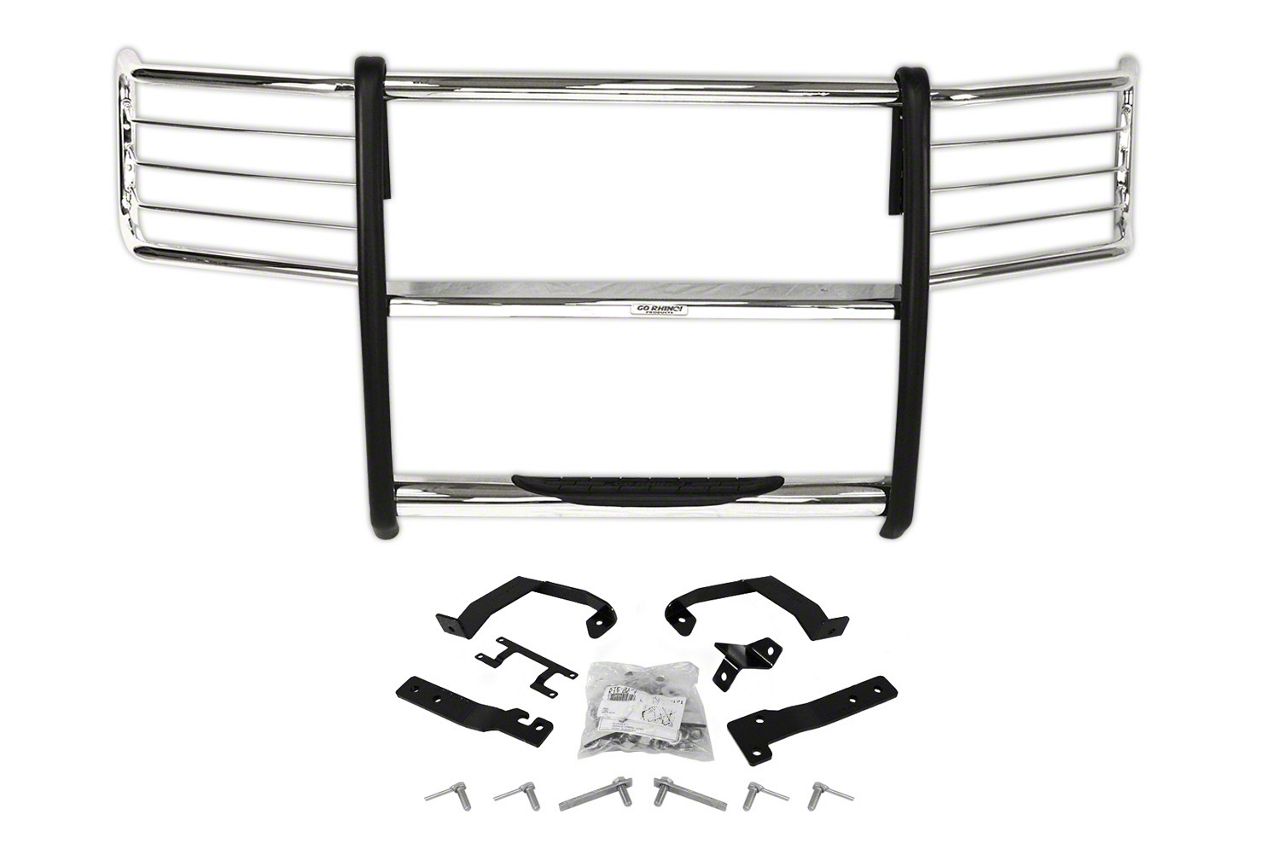 Rugged Front-End Protection. The Go Rhino 3000 Series StepGuard Grille Guard delivers reliable protection for your vehicle’s front end while offering added functionality. This grille guard includes a patented step with an oversized pad, providing secure footing for easy access to the hood and engine compartment. Its euro-style design enhances the vehicle's look while improving safety and convenience.