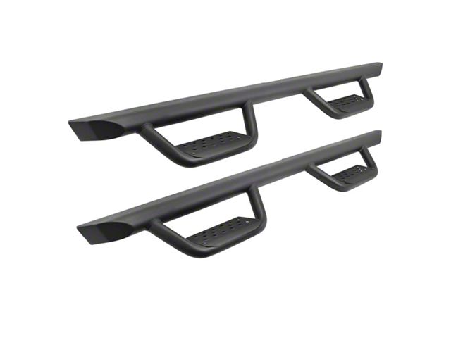 Construction and Appearance. These step bars are built using 2.50-inch heavy-duty D-shape stainless steel tubing, offering superior strength and durability. The punched steel step pads enhance grip, while the textured black finish adds a sleek, aggressive look and resists corrosion.