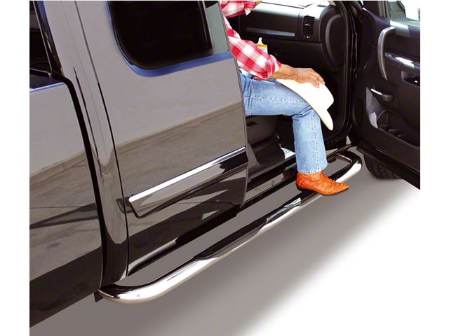 Chrome Side Step Bars. These 3-inch 4000 Series Cab Length Side Step Bars - Chrome provide outstanding support when climbing in and out of your vehicle, featuring a premium steel construction with 90 degree bends and slip-resistant step pads of which extend the entire length of your cab on both driver and passenger side.