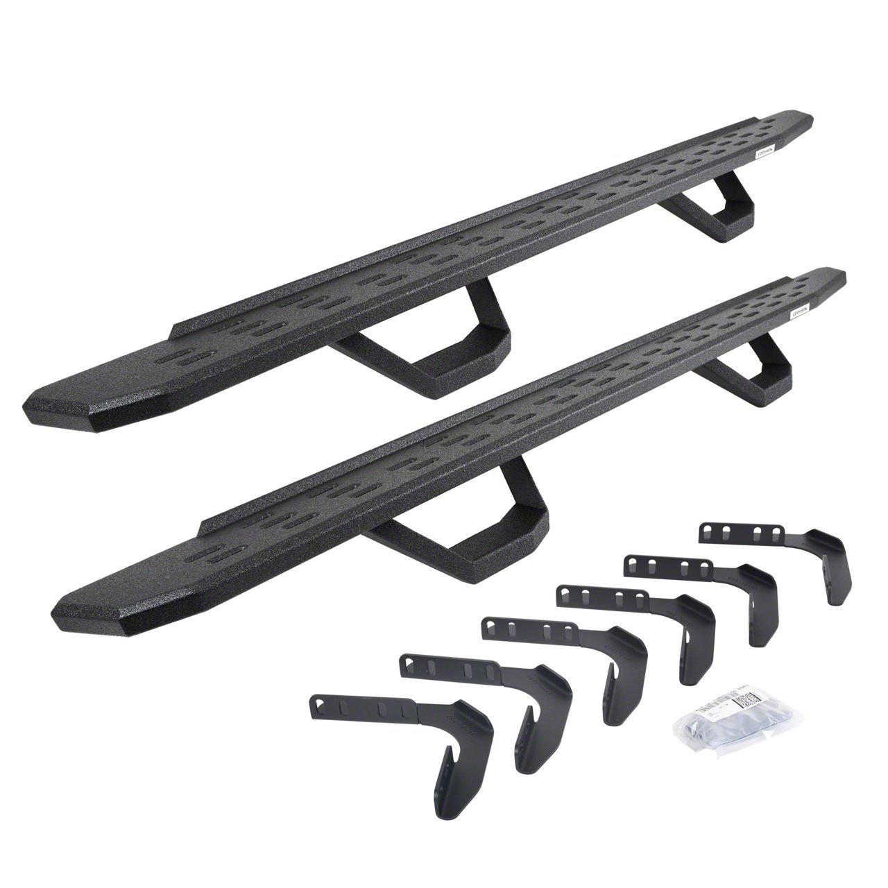 All-Weather Traction and Trail-Ready Protection. These Go Rhino RB30 Running Boards bring form and function together with a rugged bedliner coating that shrugs off corrosion and grime. The integrated drop steps make it easier to hop in and out of your lifted truck, while the platform-style board guards against rock chips and underbody wear.