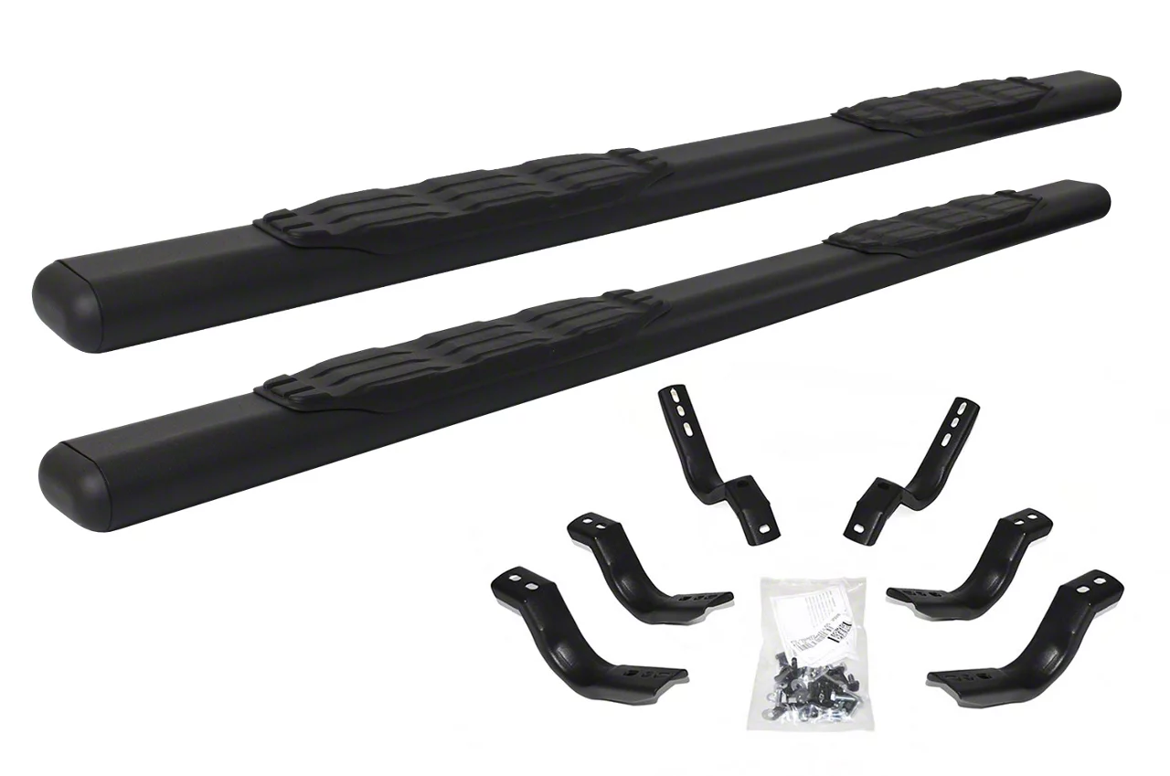 Steel Construction. These 1000 Series Side Step Bars are manufactured from 5-inch diameter oval steel tubing for superior strength. These Side Step Bars are then completed in a textured black powder coated finish for good looks and long lasting corrosion resistance. As part of the final assembly a set of rugged non-slip step pads are installed.
