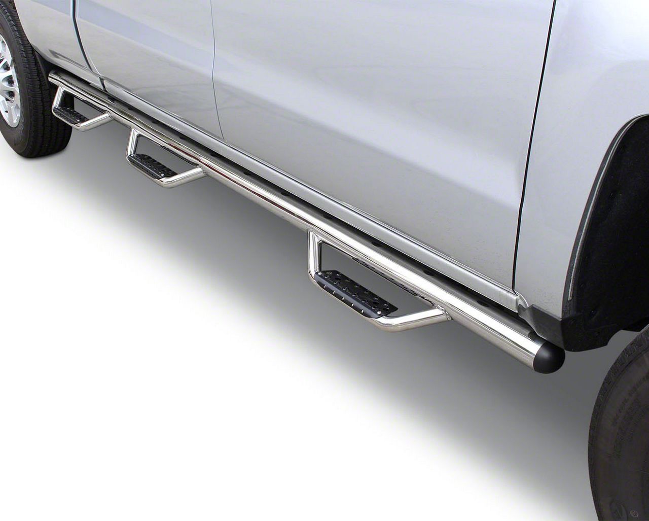 Long-Term Durability. The Dominator D3 Side Step Bars were crafted using 3-inch round, stainless steel tubing with excellent strength and high corrosion resistance. The hoop steps are furnished with punched steel step pads for all-weather high-traction stepping. Additionally, the shiny polished finish displays a bold contrast with the black step pads to give a distinctive elegance to your SuperCab.