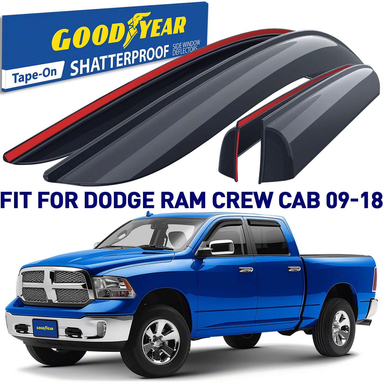 Goodyear shatterproof side window deflectors the famous high quality tape-on rain guards that let you drive with your window down in rain, snow, ice and other inclement conditions. Product features: - Made from durable, shatterproof polycarbonate; - Allows fresh air circulation; - Protects from rain and snow; - Great for hot days and smokers; - Backed by Limited Lifetime Warranty; - Windows close tightly; - Fits on top mirror mounts, no need to remove; - Gives your vehicle a cool upgraded look; - Car wash friendly. Provides a custom fit: - Dodge Ram 1500 2009-2018 Crew Cab; - Dodge Ram 2500 2011-2025 Crew Cab; - Dodge Ram 2500 2011-2025 Mega Cab; - Dodge Ram 3500 2011-2025 Crew Cab; - Dodge Ram 3500 2011-2025 Mega Cab, - Dodge Ram 1500 Classic 2019-2025 Crew Cab. Package includes: 2 Front deflectors with 3M VHB tape applied, 2 Rear deflectors with 3M VHB tape applied, 2 Degrease wipes, Installation instructions, Branded Goodyear color box, Protective shipping box. Full money refund ensures this will be your best bet for a pleasing no-risk purchase. Many customers love these Goodyear Window Guards so much they return to buy more. This makes a much appreciated gift for friends, family, and co-workers.