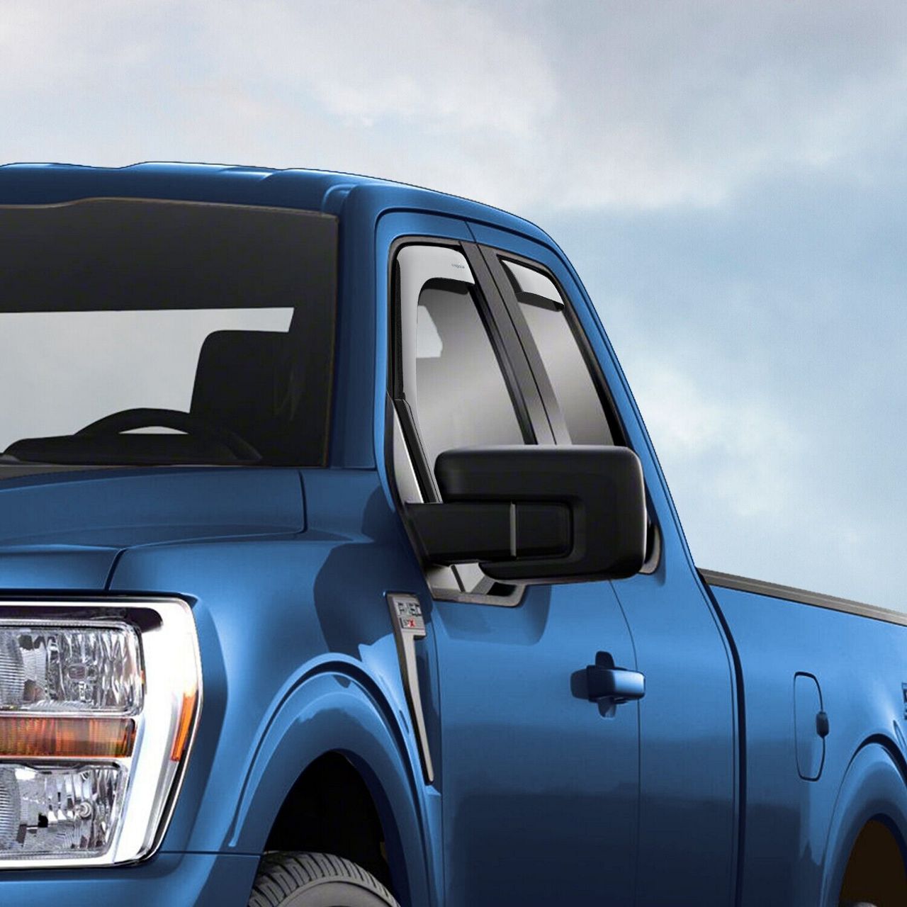 Description. GOODYEAR SIDE WINDOW DEFLECTORS the famous high quality in-channel rain guards that let you drive with your window down in rain, snow, ice and other inclement conditions. PRODUCT FEATURES: Made from durable, shatterproof polycarbonate; Allows fresh air circulation; Protects from rain and snow; Great for hot days and smokers; Backed by Limited Lifetime Warranty; Windows close tightly; Fits on top mirror mounts, no need to remove; Gives your vehicle a cool upgraded look; Car wash friendly. PROVIDES A CUSTOM FIT: - for Ford F150 2021-2022 SuperCab. PACKAGE INCLUDES: 2 Front deflectors; 2 Rear deflectors; Plastic blade; Degrease wipes. Installation instructions. Branded Goodyear color box. Protective shipping box. 100% MONEY BACK GUARANTEE ensures this will be your best bet for a pleasing no-risk purchase. Many customers love these Goodyear Window Guards so much they return to buy more. This makes a much appreciated gift for friends, family, and co-workers.
