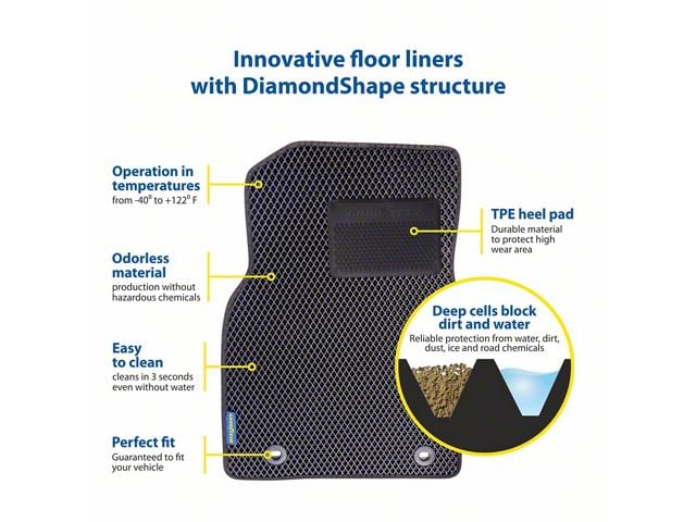 Easy to Maintain. These floor liners are dirt and mud resistant, which makes it a lot easier to clean. These are made using Advance Composite Polymer that gives your the ability to just scoop up the dirt or mud, and just use detergent and a high pressure washer for the stuck dirt.