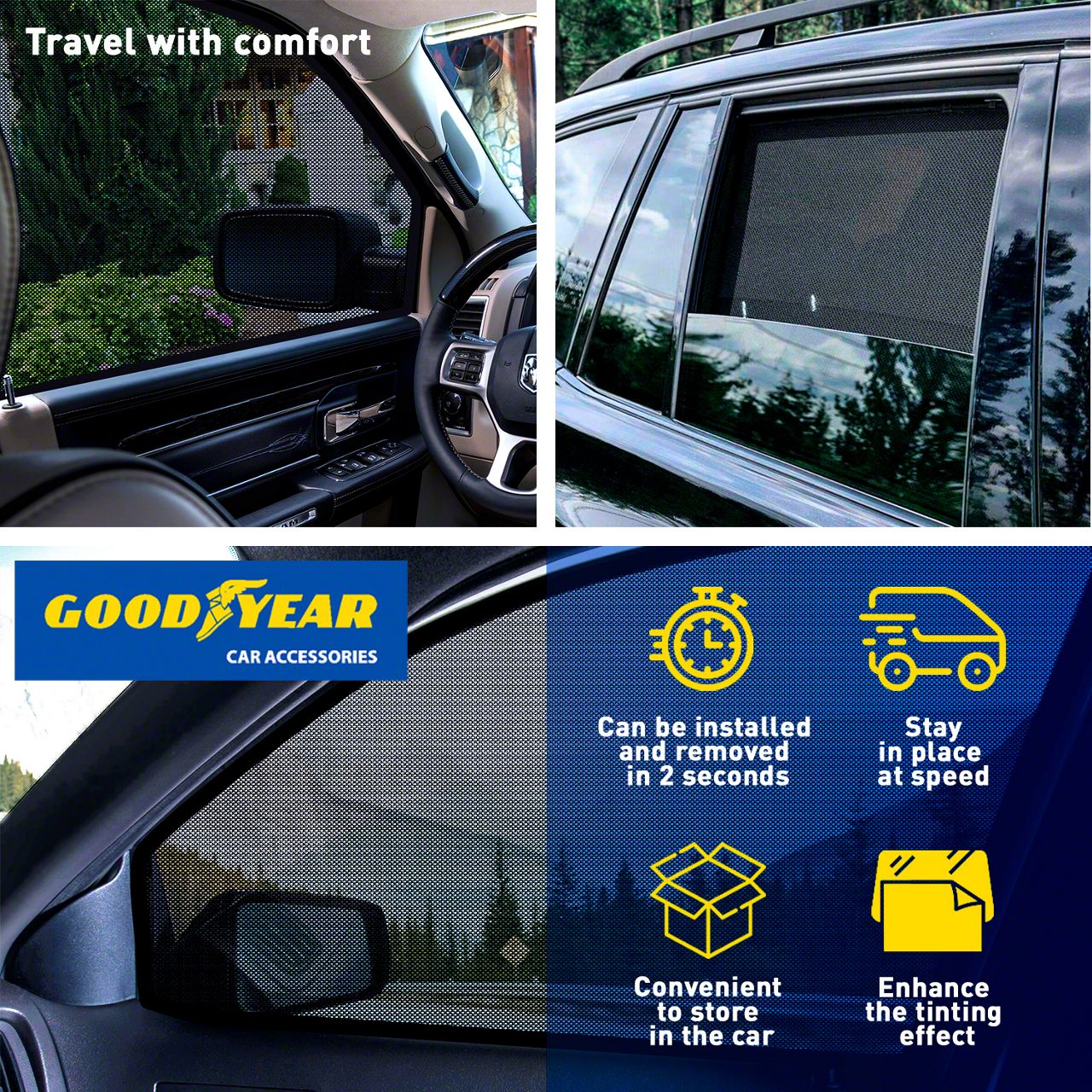 Block out harsh sun rays and keep the interior of your car cooler with Goodyear interior car side window shades that fit your passenger windows. When the sun comes streaming into your vehicle, especially the backseats, it can lead to increased temperatures in your car's cabin. And if you've got kids or passengers back there it can get really make them uncomfortable. Goodyear rear window sun shade for car help block out those sun rays and keep your car, truck, or SUV cooler, so riders can feel more relaxed and enjoy the ride no matter where you're going. Product Details: Side-Window Sunshade (4 Pc. Set); Supports Cars, Trucks, and SUVs; Optimal Window Coverage; Blocks UVA and UVB Sun Rays; Fine Mesh Adds Bug Protection; Color: Classic Black; Quick, Easy Installation; Available in Brand-Specific Options. Keep your backseats cooler for kids, pets, and passengers with UV-blocking car window shade for side windows that offer a custom fit and maximum coverage. Get a 4-piece set now by clicking Add to Cart above. Please make sure you are in compliance with all state and local laws while using these sun shades.