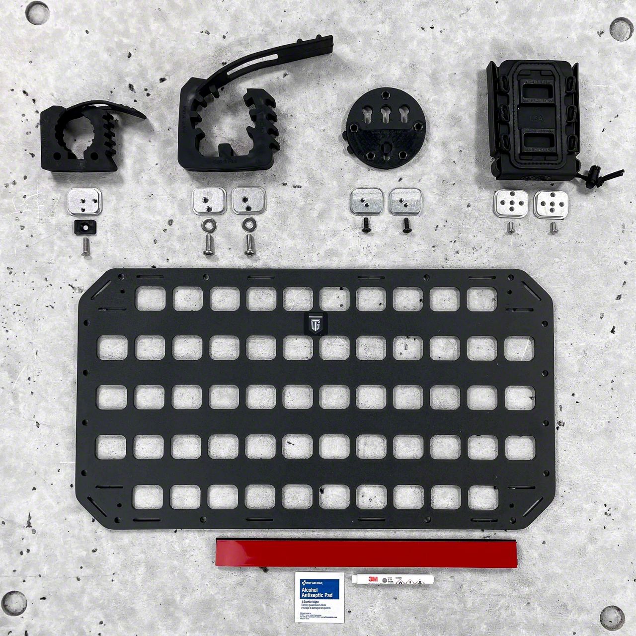 #501 features an easy installation by mounting the custom Rigid MOLLE Panel with the Pelican Case Screws into the mounting points on your lid. For lids without mounting points, install with the 3M Dual Lock Fastener Kit. Attach the G-Code Holsters Soft Shell Scorpion Mag Carrier, G-Code RTI Holster Integration Kit, and the Rifle Rack - Rubber Clamps onto the RMP using the included screws and Backer Plates for a secure and flush mount.