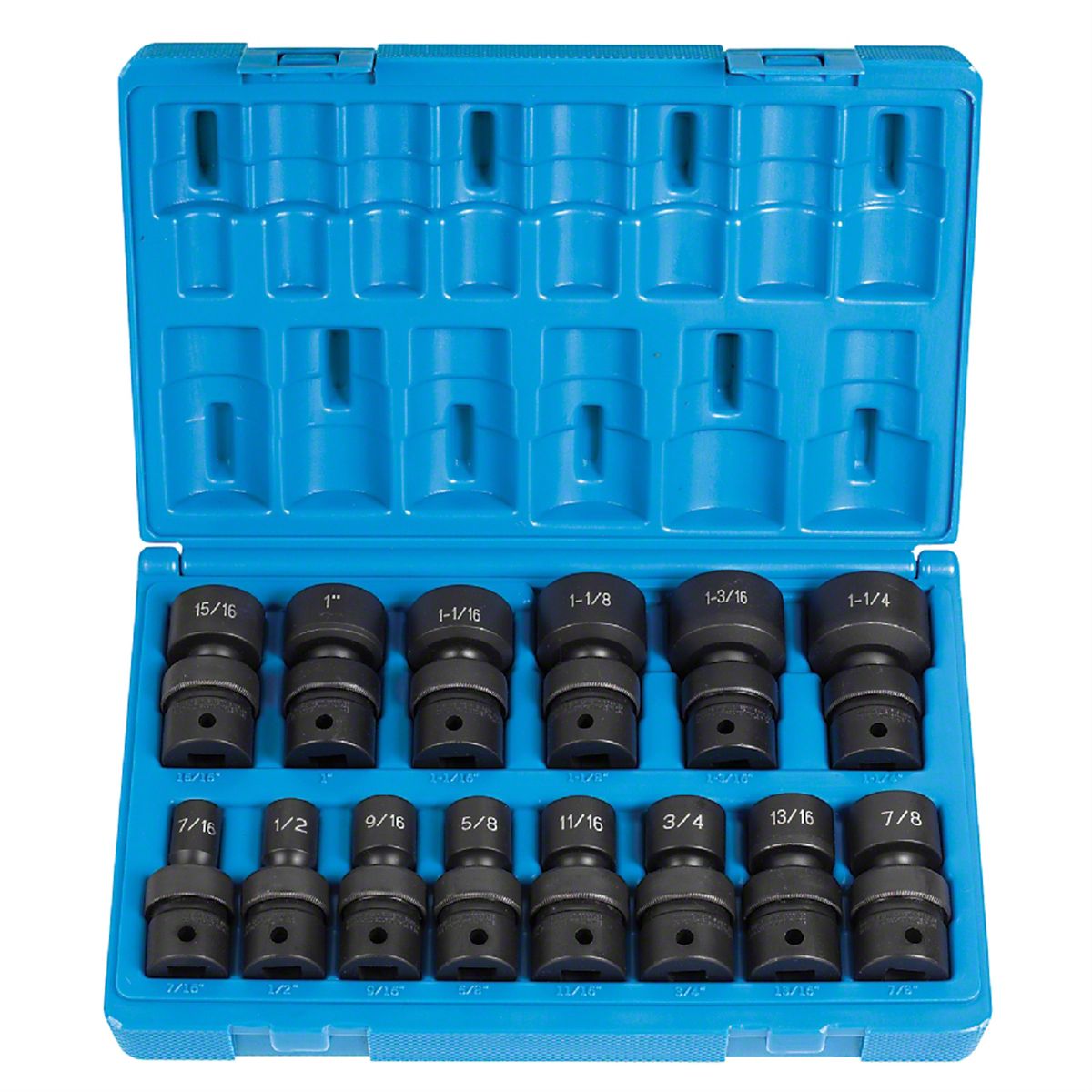 • Contains Sizes: 7/16", 1/2", 9/16", 5/8", 11/16", 3/4", 13/16", 7/8", 15/16", 1", 1-1/16", 1 -1/8", 1-3/16 in., 1-1/4" in a molded storage case.