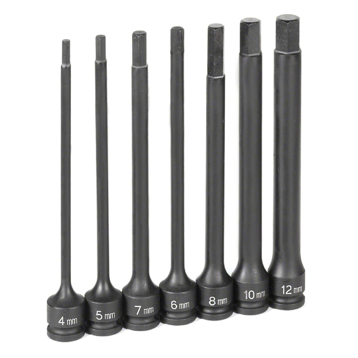 • Impact Hex Bit Socket Set, 3/8 in.; Drive, 7 Piece, 4mm to 12mm, 6 in.; Long, in Blow Molded Case. Our impact sockets grip the fastener across a broader contact area, reducing chance of rounding off fasteners. They also allow up to 20% more torque to be applied than on other impact sockets. The shift in pressure allows us to reduce the socket wall thickness, increasing access to tight areas.