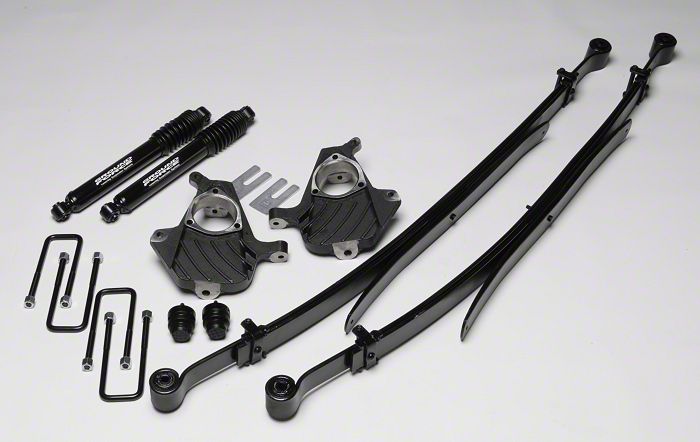 Includes Front Spindles. This lowering kit is equipped with front spindles. These components help give your truck a few inches of front drop. Also, these spindles help enhance your truck’s steering performance.