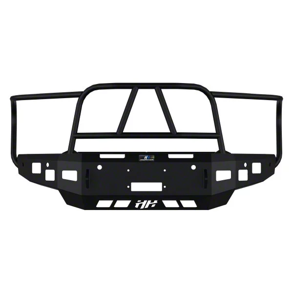 Top-Quality Functional Design. The Hammerhead Winch Front Bumper is a sturdy and durable bumper made from 3/16-inch steel with a black powder-coated finish. It comes with a full brush guard to protect the front of your vehicle during off-road driving. The bumper can accommodate up to a 12,000-pound winch, making it perfect for heavy-duty towing and recovery. Additionally, it has space for up to 4 cube fog lights, which can help improve visibility during harsh weather conditions.