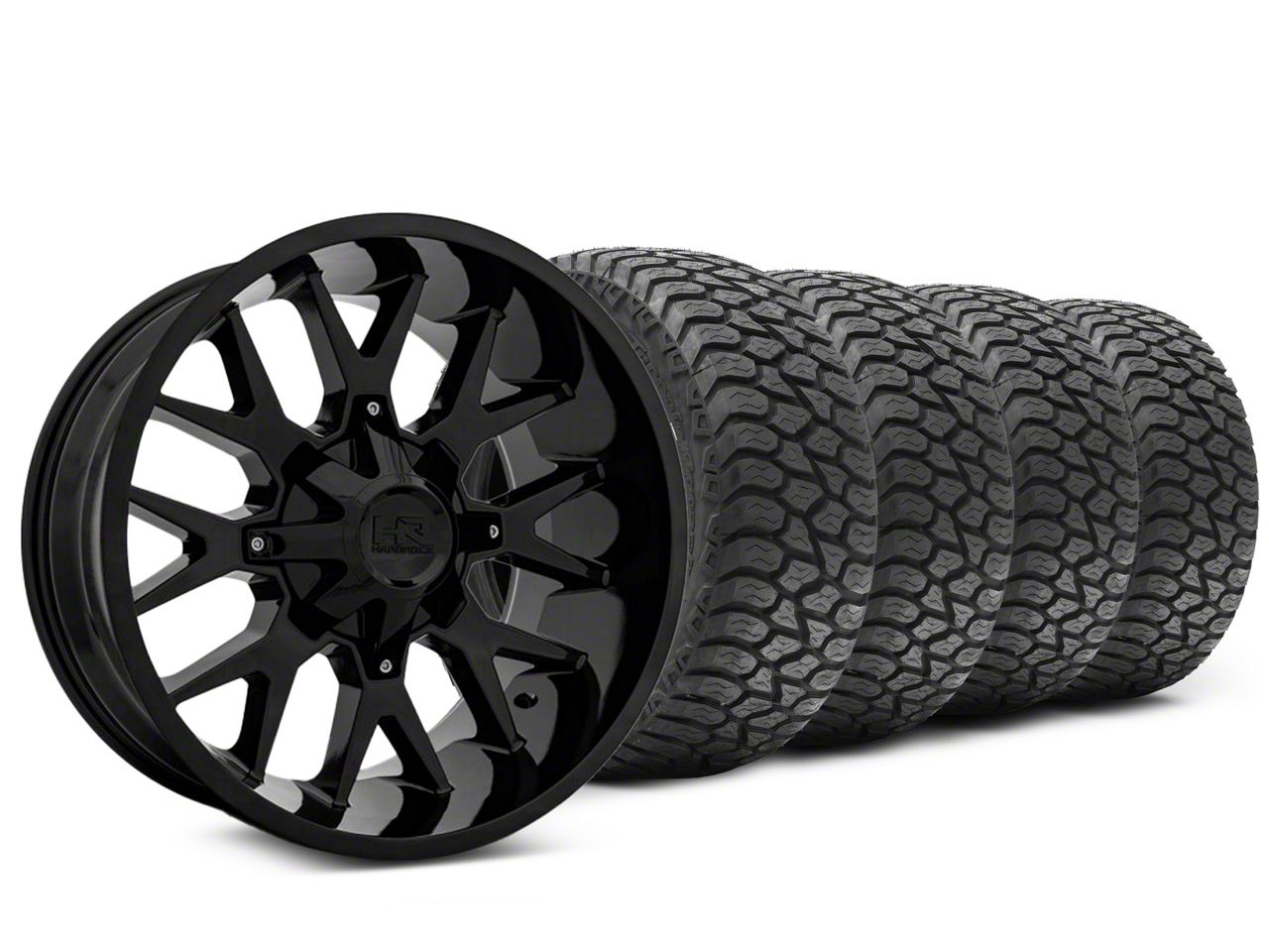 Mounted and Balanced Wheel and Tire Kit. This wheel and tire combo kit features (4) 22x10 Hardrock Offroad Affliction Gloss Black 6-Lug Wheels and (4) AMP All-Terrain Terrain Attack A/T A 33" - 33x12.50R22 tires that have been put together into an easy to buy kit that arrives to your door already mounted and balanced ready to be installed on your vehicle.