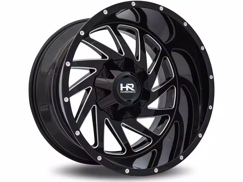 The 20x12 Hardrock Offroad Crusher Gloss Black Milled 6-Lug Wheel; 20x12; -44mm Offset is completed in a high quality, gloss black finish. The milled steel accents are where it really shines through. The accents make the split section of the spokes pop along the faux beadlock.