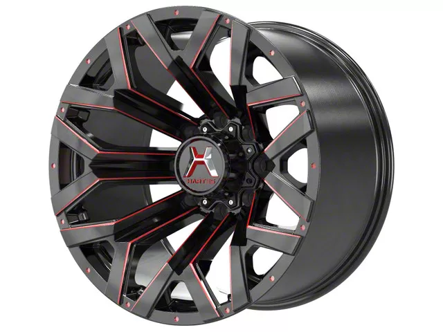 Hawkish Gloss Black Milled with Red Tint 8-Lug Wheel; 20x9; 0mm OffsetThe Hawkish Gloss Black Milled with Red Tint 8-Lug Wheel offers a sleek and sophisticated look, elevating the vehicle’s presence with its distinct design. Crafted with precision, it complements the aesthetic, adding a touch of elegance to the vehicle’s overall appearance.