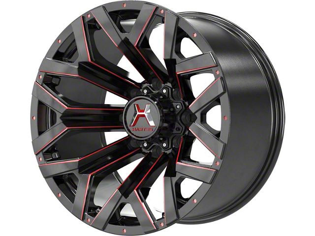 Hawkish Gloss Black Milled with Red Tint 6-Lug Wheel; 22x12; -44mm OffsetThe Hawkish Gloss Black Milled with Red Tint 6-Lug Wheel offers a sleek and sophisticated look, elevating the vehicle’s presence with its distinct design. Crafted with precision, it complements the aesthetic, adding a touch of elegance to the vehicle’s overall appearance.
