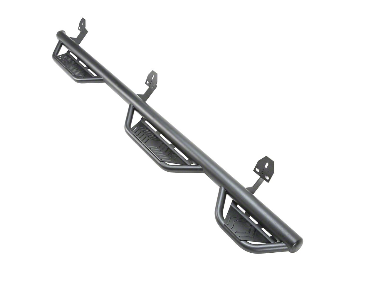 Bold Functionality. Match your RAM’s mighty exterior with a black and tough pair of HS3 Hoop Side Step Bars from Havoc Offroad. These side step bars feature hoop steps furnished with anti-slip steel plates for secure footings as you board and disembark your truck. The one-piece, wheel-to-wheel assemblies mount tight to the rocker panels for an integrated look that will not compromise your off-roading stance. Each bar also features a third step for the hard-to-reach cargo areas.