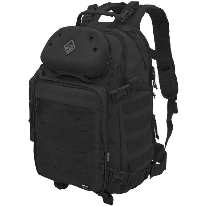 This is Hazard 4®'s first daypack with an external load-carrier 'beavertail' for helmets, jackets, etc. The carrier can flip 180° down to manage long loads like rifles, and the bottom hinges allow detaching & expanding. Drawbridge has a unique top, perimeter, or side sling-style zipper access choice, and the load carrier has an admin area. There's a molded top-shell to protect optics, and other breakables, and is also a base for our exclusive HardPoint® hardware parts. A large zip pocket on the side fits Nalgene bottles, radios, etc., and a padded laptop/hydration area in soft molded back panel can fit laptops up to 17". The back panel adds structure, back safety & air circulation, and also has a removable luggage trolly-handle strap. When this luggage strap is off, loops are left for carabiners, etc. Drawbridge comes with our removable, minimal waist belt w/ patented roto-lock buckle, and fuzzy liner on inner walls for optional dividers/photo bin inserts. Side compression straps can hold objects to pack’s sides, and there's a large flat pocket under carrier & on pack-back. Other features include: supersized laser-cut MOLLE & hook-backing i.d. patch panel, MOLLE loops on 3 sides & harness for pouches, etc., and sternum strap with elastic auto-adjust, 2-position belt height.