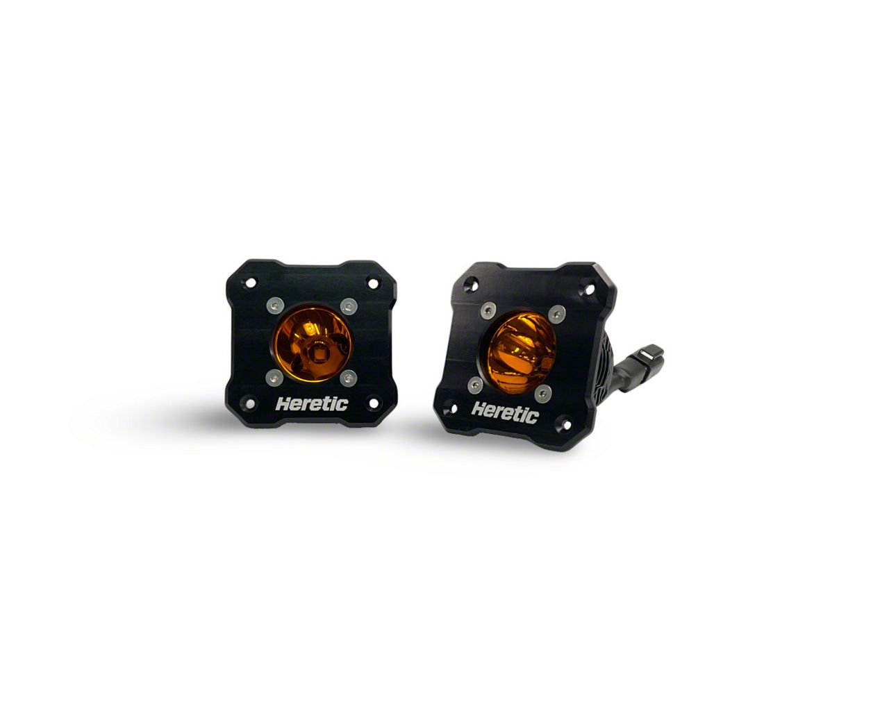 The Heretic BA-1R Amber Flush Mount LED Light Pod is our newest pod light used for various applications from an optimal chase light to a fog light and beyond. They are Designed, Assembled, Supported, and Shipped in Centerville, Utah and covered by our life time warranty. These high performance LED pod lights are housed in CNC machined aircraft-grade aluminum, and outfitted with best-in-class circuit boards that allow temperature control and long-lasting, far reaching light. The BA-1R Amber Flush Mount LED Light Pod is recommended on the front or rear bumpers of trucks, jeeps, SUVs, and UTVS. Customize Your Beam Pattern: Spot or Flood. They can also be used on the sides and rear of roof racks as a chase light.