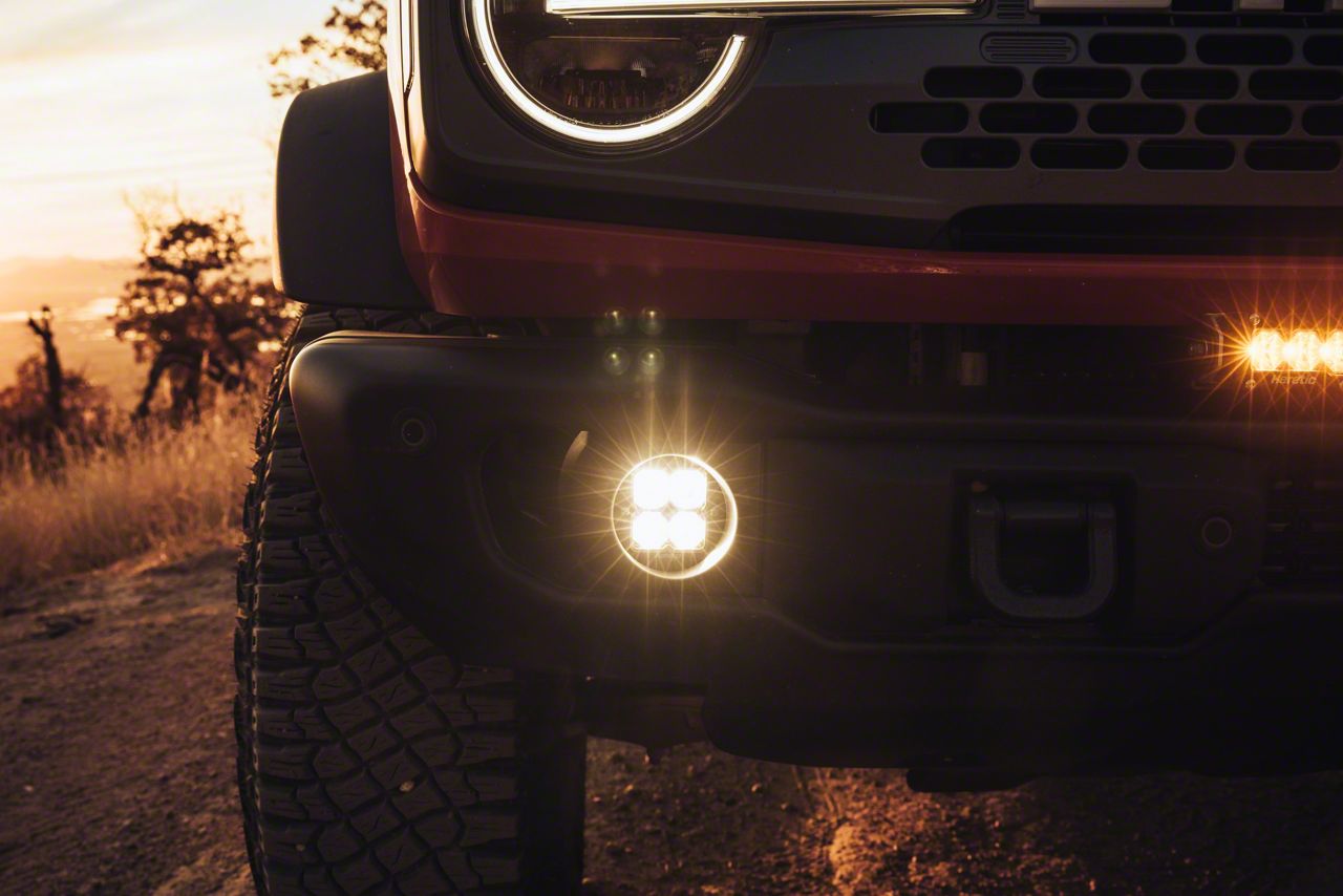 Description. The Ford Bronco LED Fog Light Kit (2021+) is the best LED fog light kit on the market for your Ford SUV. The Bronco fog light kit increases your visibility two-fold from OEM fog light kits. We’ve custom built the fog light kit housing in a sleek, simple stainless steel powder coated bracket. The install is easy with the plug and play wire harness and you can choose your selection of amber vs. clear lens options. This fog light kit is compatible with Ford Bronco ('21+) Capable Bumper.