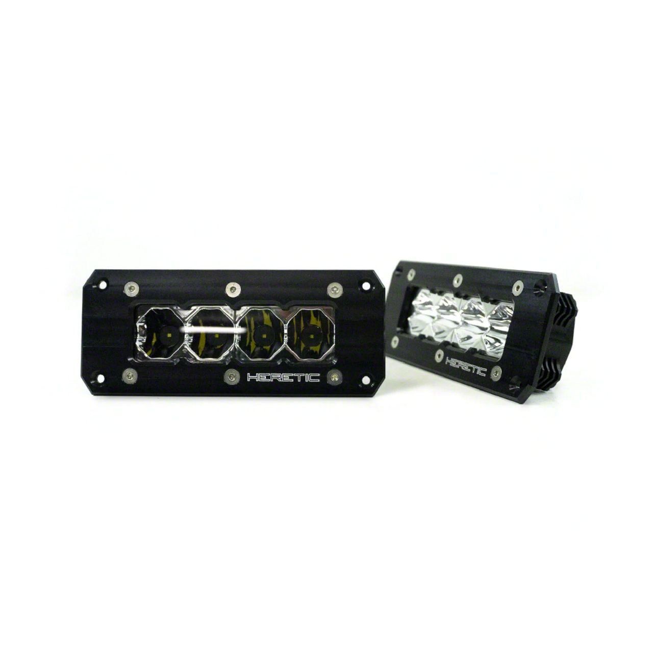 Description. The Heretic BA-4 Flush Mount LED Light Pod is known as the big brother to our staple BA-2 Flush Mount LED Light Pod. The 6-series BA-4 Flush Mount LED pod light is an optimal chase light to a ditch light, A-pillar light and beyond. These high performance clear LED pod lights are designed and manufactured in the USA, housed in CNC machined aircraft-grade aluminum, and outfitted with best-in-class circuit boards that allow temperature control and long-lasting light. The BA-4 Flush Mount LED Light Pod is recommended on the front or rear bumpers of trucks, jeeps, SUVs, and UTVS. They can also be used on the sides and rear of roof racks as a chase light. They are specifically designed to align with the curvature of your vehicle or UTV and are best for clear night conditions.