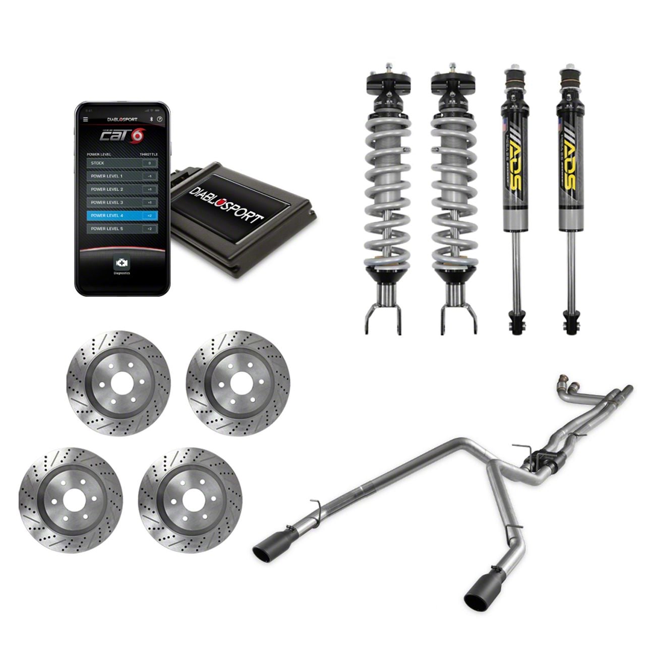 Construction and Appearance. Each component features a combination of glossy gray and polished chrome finishes that complement high-performance aesthetics. The coilovers and shocks are built for rugged terrain, while the brake rotors and caliper brackets are crafted to resist heat and wear under demanding off-road use. The cat-back exhaust is engineered for both power and a deep performance tone.