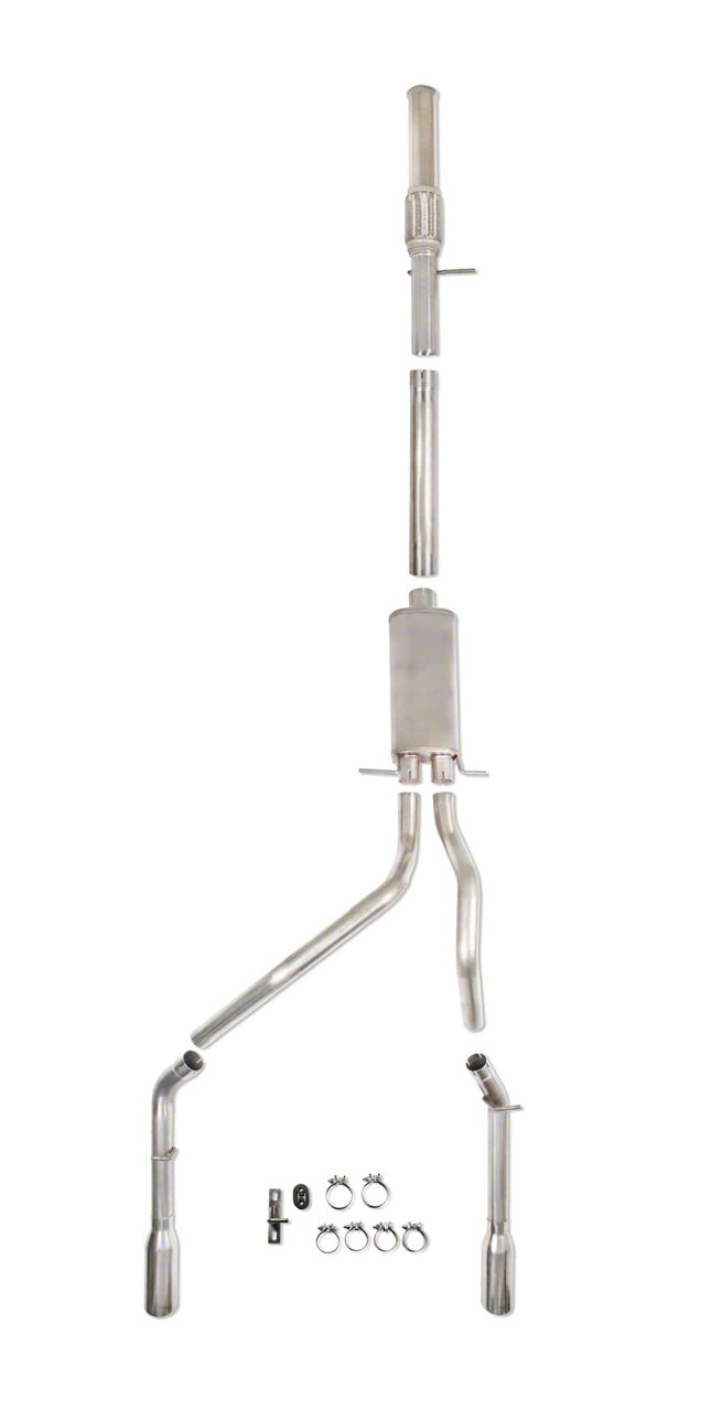 Speedster Aesthetic. Bring out the speed-demon in your Silverado and give it a more impactful growl with this Hooker BlackHeart Dual Exhaust System with Polished Tips; Rear Exit. Flaunting a split-rear exit, this Cat-Back Exhaust Kit offers cooler output and high-flow mandrel bends to deliver uninhibited performance resulting in a strong, appealing exhaust tone.