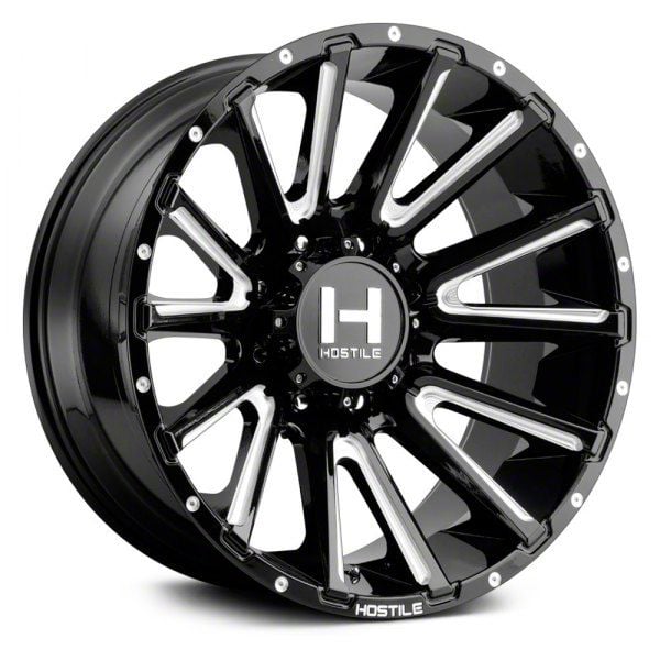This 22x12 Hostile Typhoon Blade Cut 8-Lug Wheel is completed in a high-quality gloss black finish with milled accents to create an impressive appearance. There's a durable clear coat that protects against driving hazards.