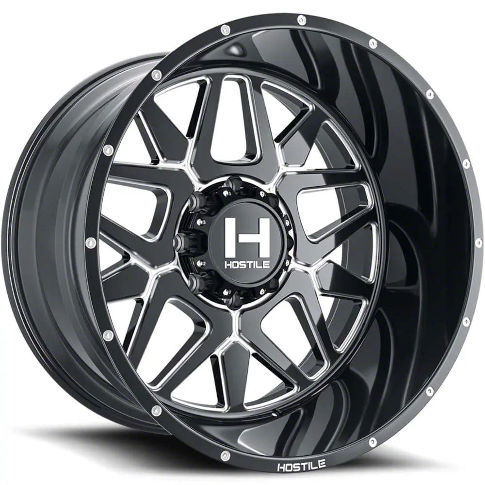 The 24x12 Hostile Diablo Blade Cut 8-Lug Wheel is completed in a high-quality gloss black finish with steel milled accents for an aggressive appearance. For added protection and good looks, there is a durable clear coat that withstands the rigors of everyday driving.