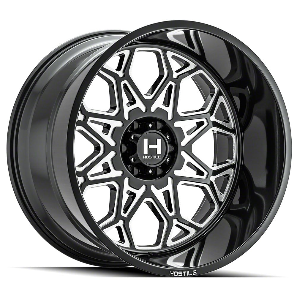 The 20x12 Hostile Anvil Blade Cut 6-Lug Wheel is completed in a high-quality gloss black finish with steel milled accents for an aggressive appearance. For added protection and good looks, there is a durable clear coat that withstands the rigors of everyday driving.