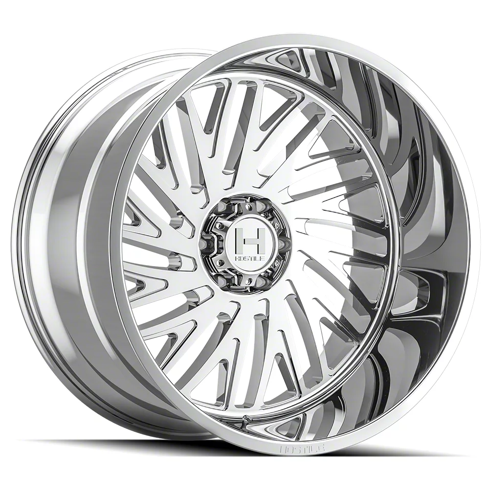 The 20x10 Hostile Syclone Armor Plated 6-Lug Wheel is completed in a high-quality chrome finish that is accomplished in a 3-step plating process. First layer is copper, which creates a smooth foundation. Next is nickel for hardness and durability. Finally, chrome for brightness.