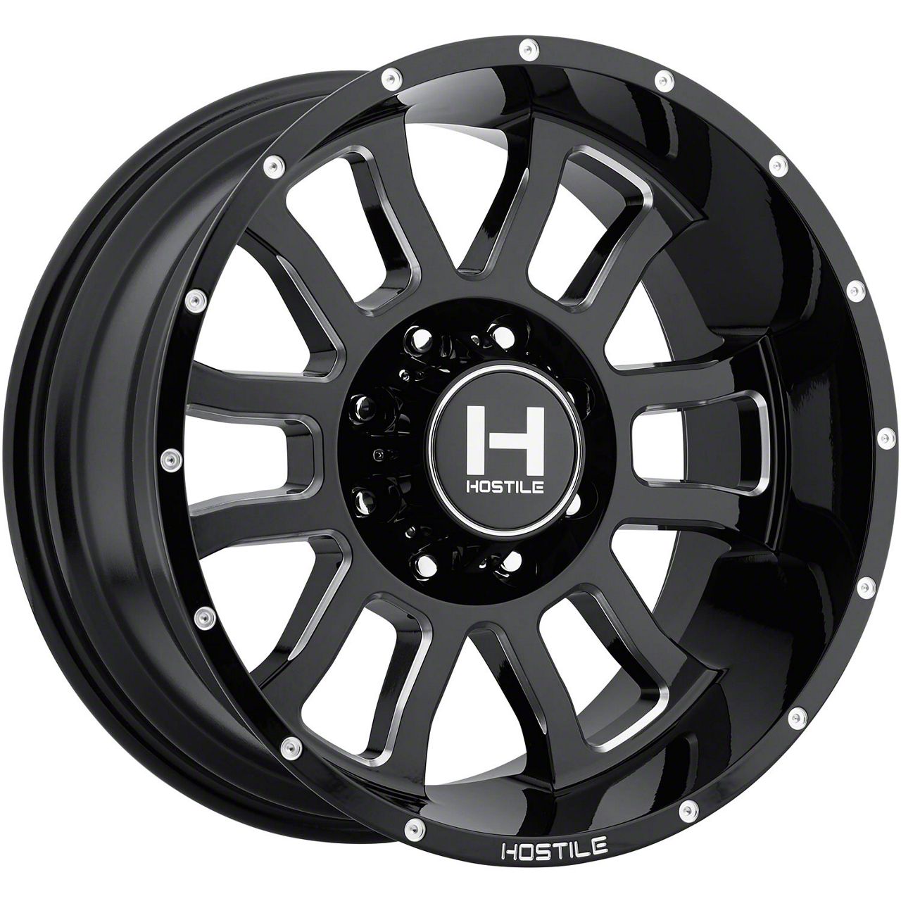 This 20x10 Hostile Gauntlet Blade Cut 8-Lug Wheel is completed in a high-quality gloss black finish with milled accents to create an impressive appearance. There's a durable clear coat that protects against driving hazards.