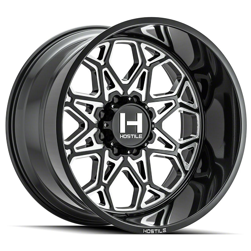 The 24x14 Hostile Anvil Blade Cut 6-Lug Wheel is completed in a high-quality gloss black finish with steel milled accents for an aggressive appearance. For added protection and good looks, there is a durable clear coat that withstands the rigors of everyday driving.
